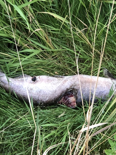 Enten er det grødeskæreren, der har ramt fisken, men hvordan er den så endt højt oppe på brinken? Men hvis det er f.eks er en sæl, hvorfor er fisken så ikke spist?